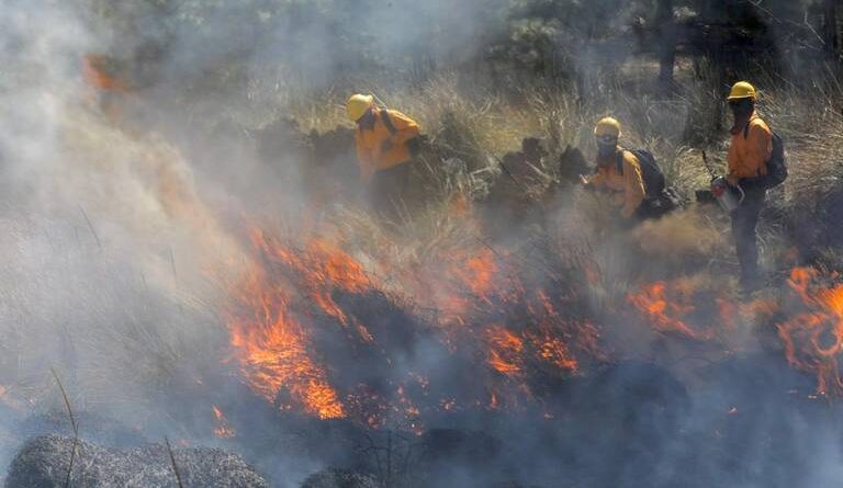 Brigadistas combaten incendio en Cerro de la Cruz en Acuitzio
